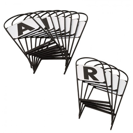 Las 12 letras pista Doma Clasica son para una pista de 60 x 20. Con las 12 letras se cubren todas las referencias imprescindibles en un cuadrilongo grande de Doma Clásica. También destacar que el soporte es metálico y las letras son un adhesivo sobre el rectángulo metálico.