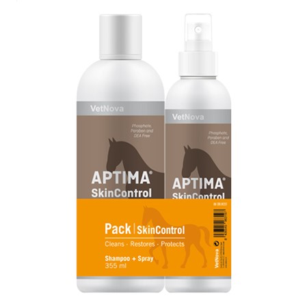 El set Aptima Skin Control caballos es un pack de champú y spray dermatológicos para pieles expuestas a ambientes húmedos, con acción secante, lipolítica y queratolítica. Este es un pack compuesto de champú en un envase de 355 mililitros y un spray de 236 mililitros.