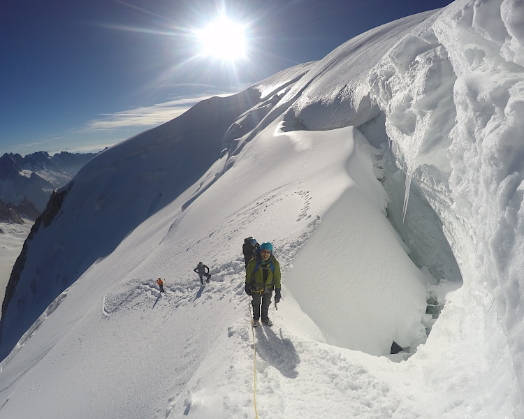 1. Falta de preparación técnica. No es lo mismo subir al Aneto de 3404 metros que cuenta con minúsculo glaciar sin grietas y unos tramos de trepada en roca muy cortos que subir al Mont Blanc de 4810 metros, que cuenta con inmensos glaciares donde tendremos que vigilar y sortear grietas además de escalar importantes pendientes de hielo, nieve, roca o mixto y toda ello aderezado con el factor de la altitud. No es lo mismo ser autónomo y lidiar con todas estas dificultades que acompañarse de un guía que liderará la cordada, superará los tramos difíciles y te ayudará a superarlos.
