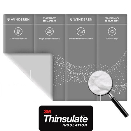 - Una segunda capa termo-aislada con el tejido denominado Thinsulate de 3M. Es un tejido con propiedades termo-reguladoras. Además es transpirable. No es un material absorbente. Y expulsa la humedad hacia el exterior evitando que las extremidades se calienten. Otra característica de este material es que no comprime ni se resbala. También destaca por que tras varios lavados permanecen sus características.