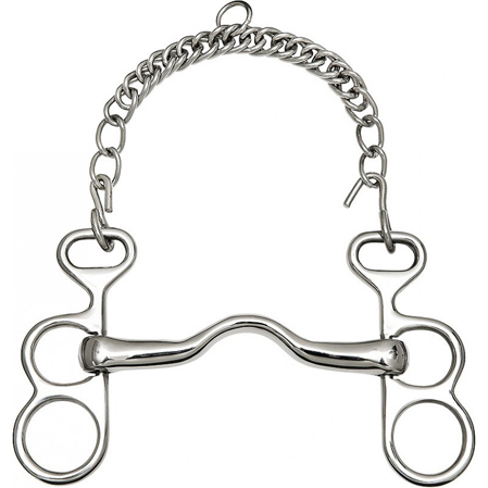 El bocado Barcelona enganche lleva un suave desveno en el centro de la embocadura. El ajuste de las riendas puede ser en una de las dos anillas de laterales. Además este es un bocado fabricado en acero inoxidable. Esta disponible en 3 anchos de embocadura: 11´50, 12´50 y 13´50 centímetros. Añadir que el bocado viene presentado con cadenilla y con los dos alacranes. Y la cadenilla y ambos alacranes también están fabricados de acero inoxidable.