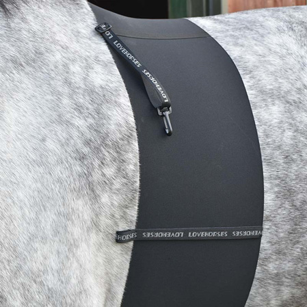 - La cincha no debe de estar ajustada necesariamente por encima del Body Bandage. Puede estar ajustada al lado de este. La longitud de las correas pueden ajustarse hasta en unos 5 o 6 cm de la cincha en dirección a la grupa del caballo. Esta distancia cubre un 20% adicional de superficie cubierta o protegida, muy útil sobre todo en casos de que ya se haya producido una herida.