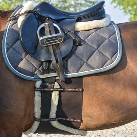 - La banda se coloca alrededor de la montura, en contacto directo con el caballo. El cierre se realiza mediante velcro. Debajo del velcro la faja lleva una pieza de borreguillo natural para que el caballo no se roce.