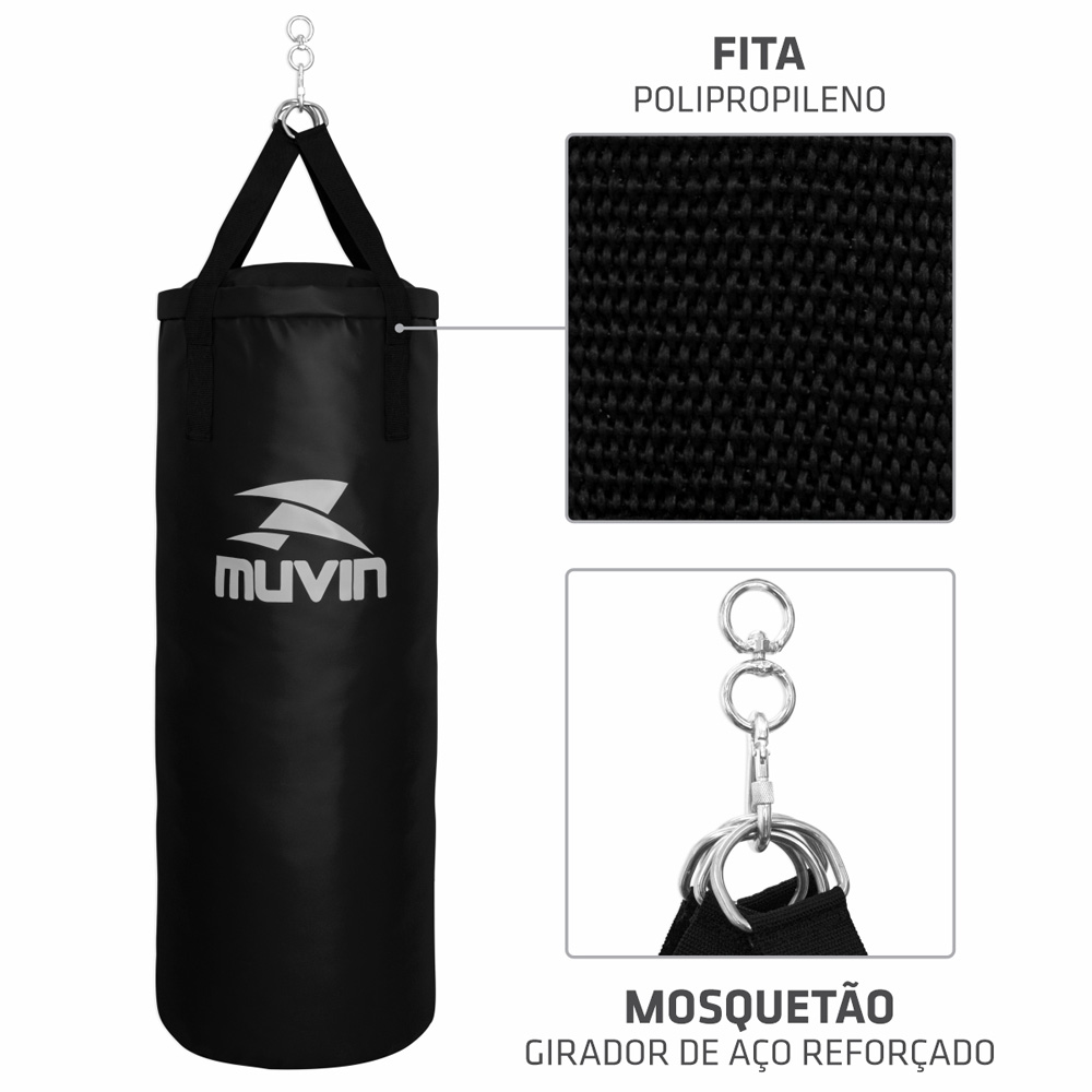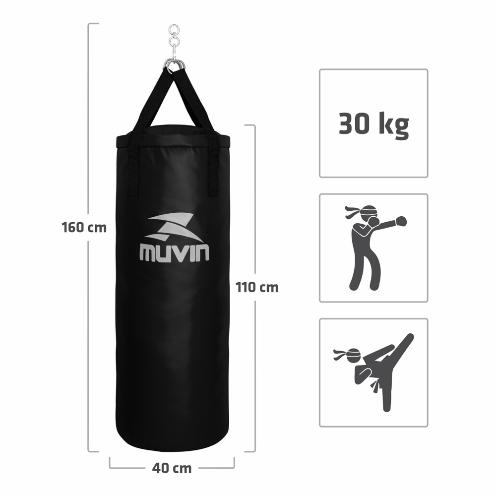 TAMAÑO: El Saco de Boxeo Vacío Muvin mide 110cm x 40cm y soporta un peso de hasta 30kg aproximadamente.