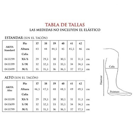 Por lo que se refiere a las medidas son unas botas básicamente de mujer. Los números del pie están comprendidos entre el 37 y el 42. Cada número de pie consta de dos alturas diferentes (estándar y alto). Y, a su vez, cada una de las dos alturas cuenta con tres anchos del gemelo. Ver gráfico en imágenes.