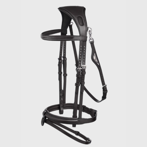 La parte de la testera cuenta con una superficie más amplia para distribuir la presión en la nuca. Las carrilleras planas son fáciles de sujetar y ajustar a la brida. Mientras que la frontalera suavemente almohadillada está diseñada para evitar la presión y cuenta con un orificio angular para la cabeza que evita la presión en las orejas. Además, la muserola de estilo francés incluye un simple cierra-bocas desmontable lo que la convierte en una muserola versátil.
