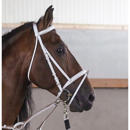 - Otra característica de la cabezada es que lleva una muserola y un cierra-bocas en color blanco.