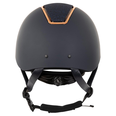 Casco Omega Painted Glitter de la marca BR. Un bonito casco con la zona superior con cristales muy finos. A juego el ribete metálico definiendo la banda superior en color cobre. Además la visera del casco es ancha. También es un casco ligero con orificios de ventilación. El protector de la barbilla es suave y fabricado en Cooldry, material ligero y siempre seco. Otra característica es el forro desmontable interior para poder lavarlo.