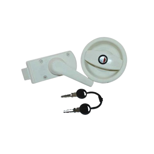 Cerradura exterior blanco perla con cerradura interior blanca crema para puerta de caravana con apertura a la izquierda.