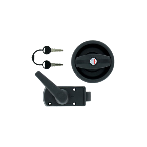 Cerradura exterior negra con cerradura interior negra para puerta de caravana con apertura a la derecha.