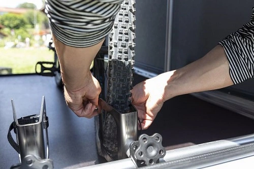 - Soporte de cubierta principalmente adecuado para bicicletas con cubierta MTB clásica (ancho 53-60 cm) y más delgadas (bicicleta de carretera y trekking o bicicletas de ciudad)
