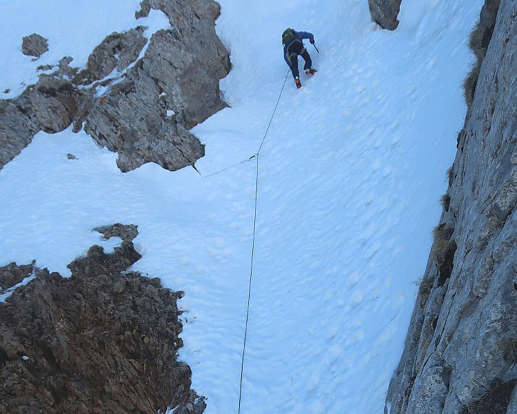 Como material técnico es necesario el casco, arnés, grampones, y piolet, varios anillos de cinta cosida (de 60 y 120cm.Ø ), aparato asegurador-rapelador (para cuerda doble), 1 cordino de 1,5m., 7mm de Ø, 3 mosquetones de seguridad (al menos 1 que sea HMS) y el material de seguridad específico para las avalanchas, ARVA, pala y sonda.