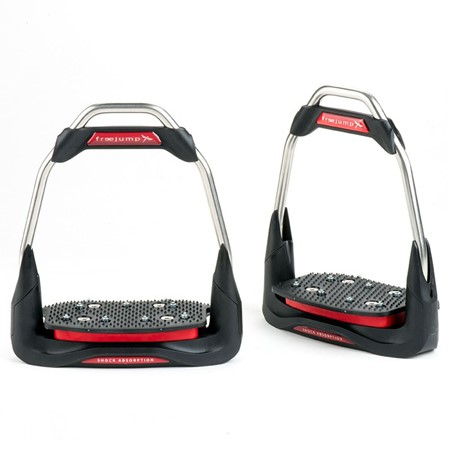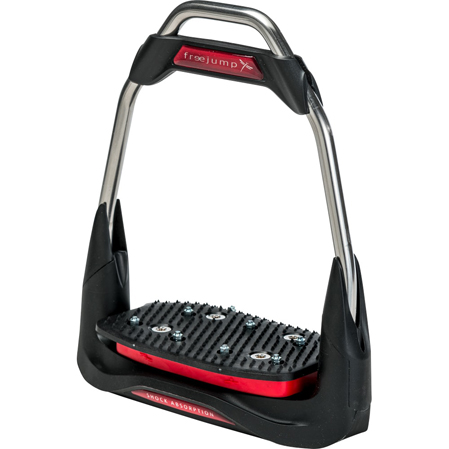 Los estribos Freejump Air´s con el pasador de la ación de estribo en la posición tradicional. Ni inclinado ni en una posición de 30 grados. Un nuevo concepto en los estribos de salto tradicionales.