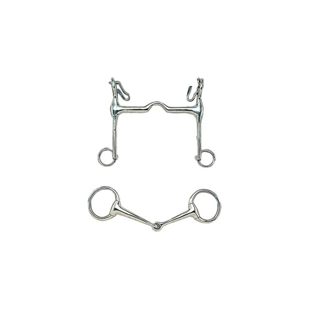 El set de filete bocado caballos Two están fabricadas ambas embocaduras en acero inoxidable. El bocado lleva un suave desveno en el centro de la embocadura. Y el filete es una embocadura simple articuladas y con olivas. Además ambos conjuntos están fabricados en dos anchos de 12´50 y de 13´50 centímetros.