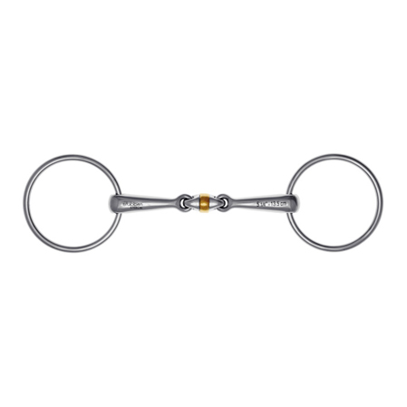 El filete Stubben anilla movil es una embocadura de tres piezas. Además es característico por la anilla en el centro de la tercera pieza por estar fabricada con cobre dulce. Esta aleación consigue que los caballos acepten mejor la embocadura ya que es un material mas gustoso para ellos. Se sienten más cómodos con el cobre dulce. Ello les lleva a masticar y a salivar en mayor medida. También se consigue que la presión de la embocadura sea menor con el cobre dulce. Otra característica de la anilla es su movimiento giratorio. Ello aún estimula mucho más la boca del caballo, sobre todo en caballos nerviosos.