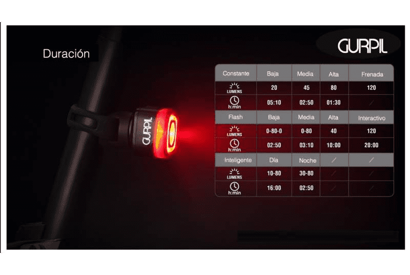 La luz trasera GP-120 cuenta con dos modos de iluminación: luz fija y luz parpadeante Flash. Y cada uno de ellos con 3 niveles de intensidad, independientemente de la actuación automática que les otorga el sensor de luminosidad.