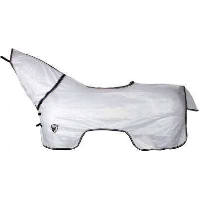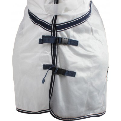 La manta antimoscas montura con la forma para poder ajustar la manta con la silla al caballo. Además esta es una manta con una extrema transpiración. Esta fabricada a modo de rejilla y el aire pasa po ella constantemente. También es una manta que viene con un cubre-cuello fabricado de la misma rejilla que el resto de la manta protectora de los insectos.