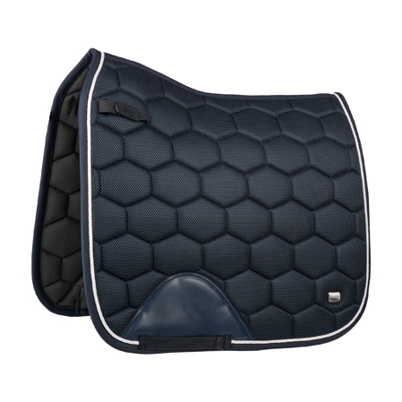 Elegante mantilla doma clasica con la particularidad de estar fabricada con un tejido de malla con una alta transpirabilidad. De esta manera el dorso del caballo siempre se mantiene seco. Además el tejido en contacto con el caballo es muy suave. Como adorno cuenta con un ribete en color blanco a juego en los diferentes colores.