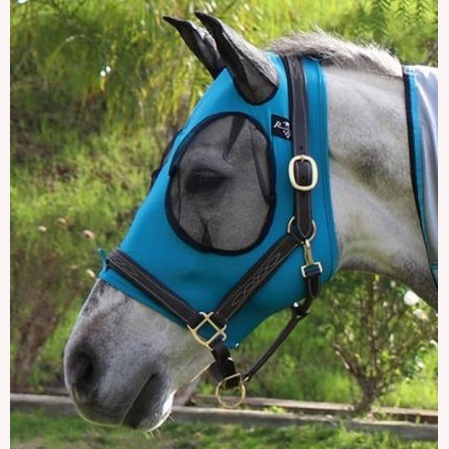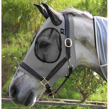 La máscara para los insectos esta fabricada con una lycra lisa, elástica y muy transpirable. También destacar que la máscara protege y no resta visibilidad ni oído. Además la forma anatómica del alrededor de los ojos hace que al caballo se le ajuste mucho mejor.
