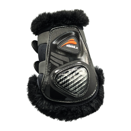 Protectores Equick Carbono borreguillo de delante para las manos del caballos y de atrás o de pies. Con una lámina de carbono cada uno para absorber impactos fuertes y con borreguillo artificial en el interior. Además disponen de un diseño anatómico que envuelve el tendón proporcionando una protección efectiva ante posibles lesiones. Tanto el delantero como el trasero cuentan con la lámina de carbono. La carcasa exterior de ambos esta reforzada con TPU (goma endurecida). Además están equipados con dos puntos de sujeción elásticas y ajustables en 3 posiciones diferentes.