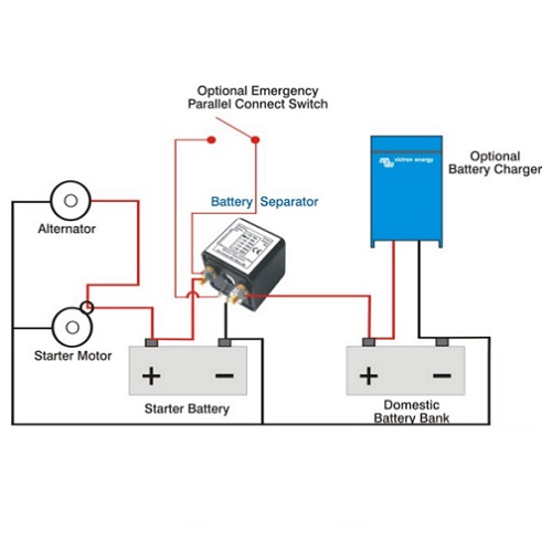 La batería de arranque nunca debe quedarse vacía, por ello es usual conectar la dinamo a la batería. Las otras baterías, como las de suministro, se pueden conectar a la batería de arranque con el separador de baterías de Cyrix. El separador asegura que todas las baterías estén conectadas en paralelo, tan pronto como el voltaje de la batería de arranque haya subido lo suficiente.