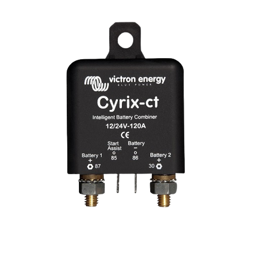 El relé Victron Energy Cyrix-ct, consta de un microprocesador que desconecta automáticamente las baterías, cuando el voltaje cae por debajo de un valor determinado y las vuelve a conectar en paralelo, cuando la carga de una de ellas, sube por encima de un determinado valor.