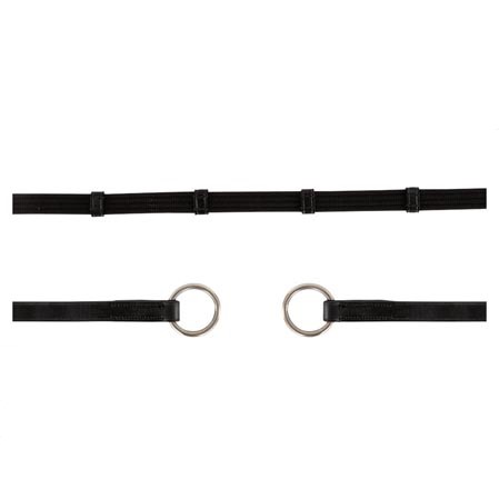 Las riendas con anillas se ajustan al filete mediante las dos anillas dispuestas para este fin. No con las tradicionales hebillas. Además es un sistema de ajuste completamente estético. El jinete o amazona no nota ninguna diferencia mientras monta. Las riendas también destacan por estar fabricadas de lona. Y cuentan con 7 tacos de cuero para ajustar el contacto de las manos de manera simétrica a ambos lados del caballo.
