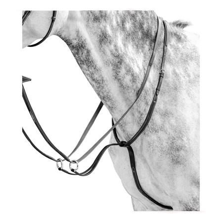 Las tijerillas caballos Prestige E54 se ajustan por la cincha hasta el pecho y desde este punto se ajustan por el cuello con una correa y una hebilla. Además estas tijerillas están decoradas con diferentes relieves o bombeados sobre el cuero. Concretamente en determinadas zonas alrededor del cuello y también en la correa que va hacia la cincha.