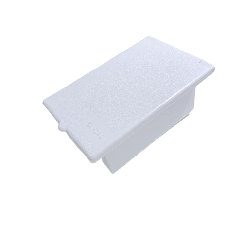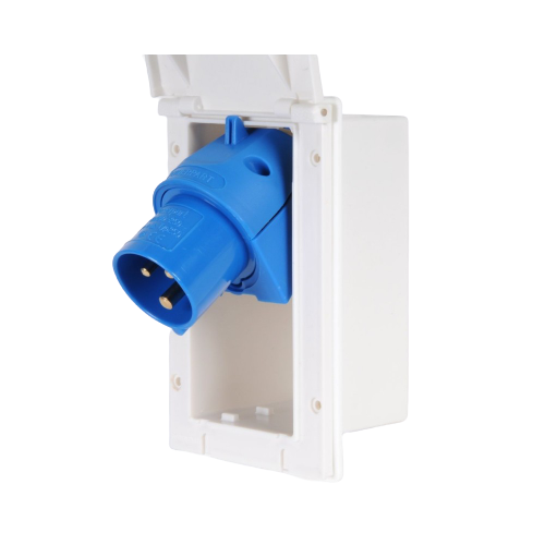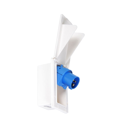 Toma exterior 220V CEE rectangular con tapa abatible, en color blanco.